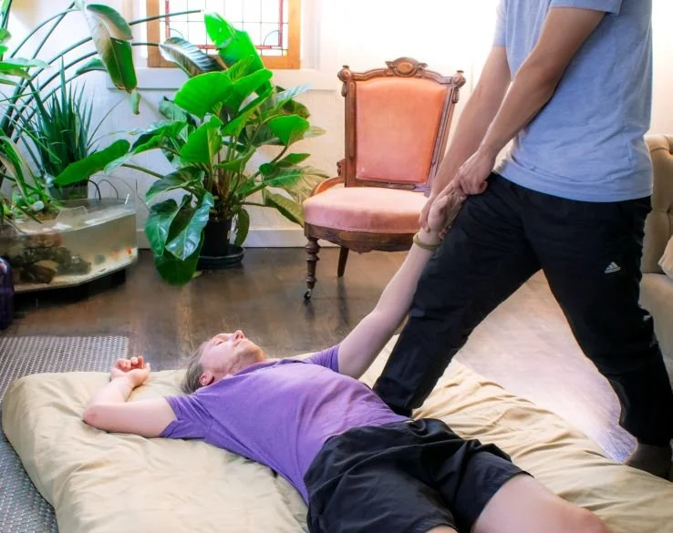 Thai Massage is a form of massage that is done on the floor on a mat while staying dressed. This allows for greater freedom in the body positions and stretches you’ll be put in, and allows me to access your achy, sore tissues with greater pressure using my feet or knees, on top of the regular hands and arms. Typically, lubricants such as oil or lotion are not used, meaning that there are less gliding movements. Instead, you may experience compressions that sink into your tissues, rocking/shaking that allows your tissues to loosen, and stretches in all planes of motion.
